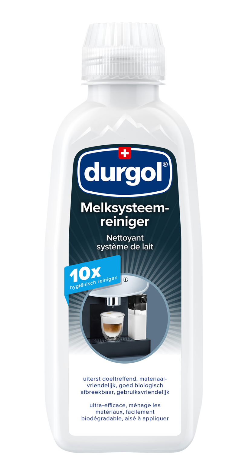 We raden u aan om uw machine regelmatig te reinigen en voordat zich een grote hoe- veelheid melkresten heeft opgehoopt - idealiter om de twee weken. Om de beste kwali- teit koffie en een lange levensduur van uw machine te garanderen, adviseren wij de durgol melksysteemreiniger. Dit houdt het volle melksysteem schoon en hygiënisch.