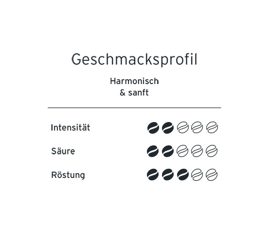 Dit smaakprofiel omschrijft een harmonische en zachte koffie-ervaring met een gebalanceerde smaak en milde intensiteit. Het is ideaal voor koffieliefhebbers die houden van een subtiele, verfijnde smaak zonder te sterke of bittere tonen.